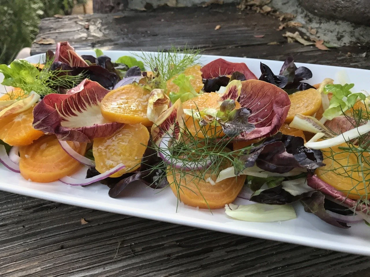 Shaved Fennel & Roasted Adirondack Blue Potato Salad with Roasted Yellow Peppers & Whole-grain Mustard Vinaigrette